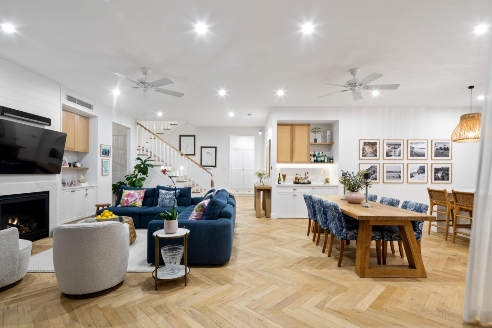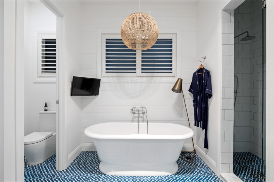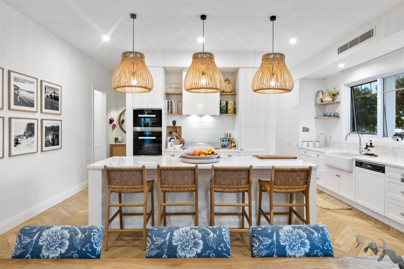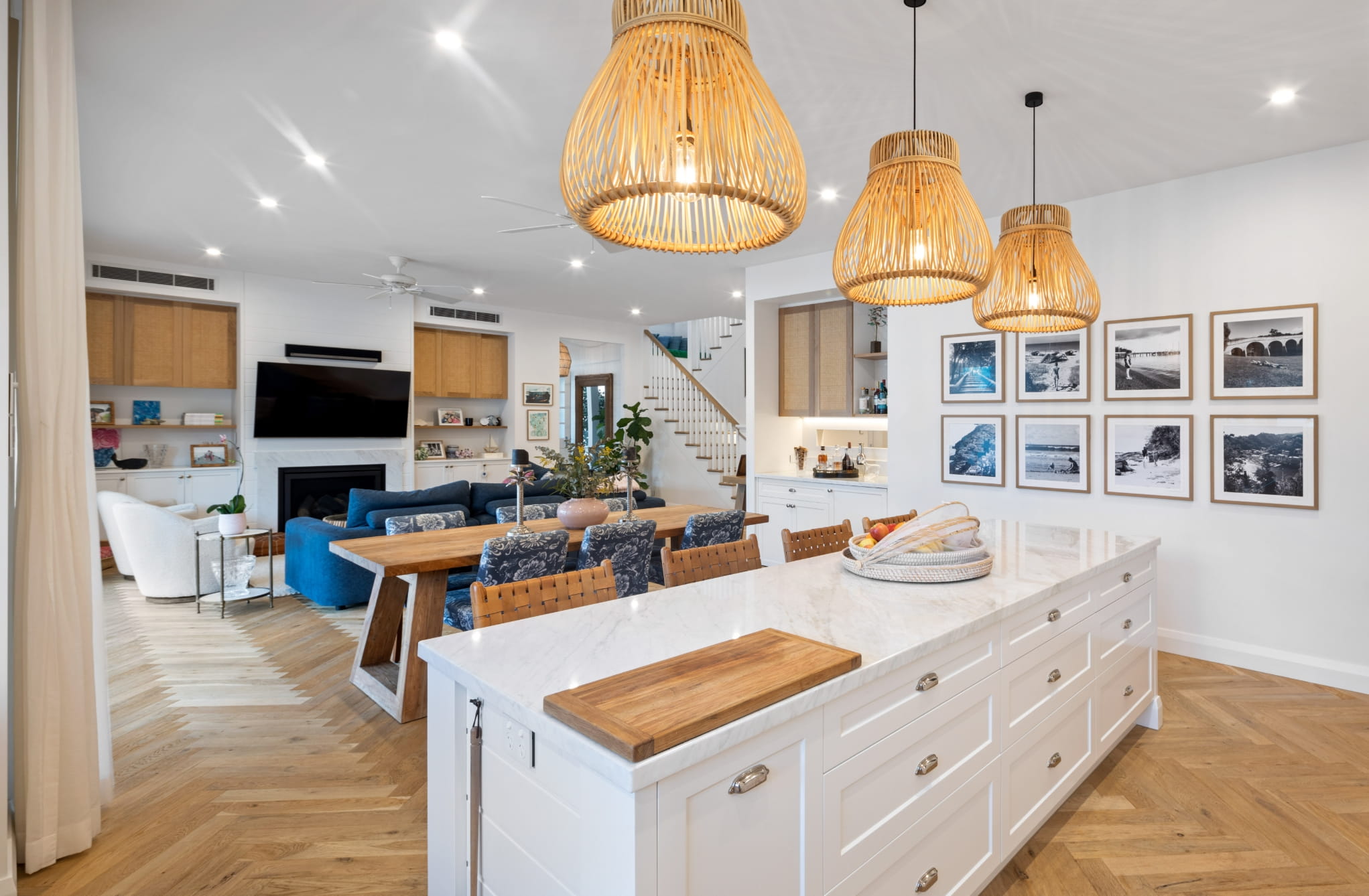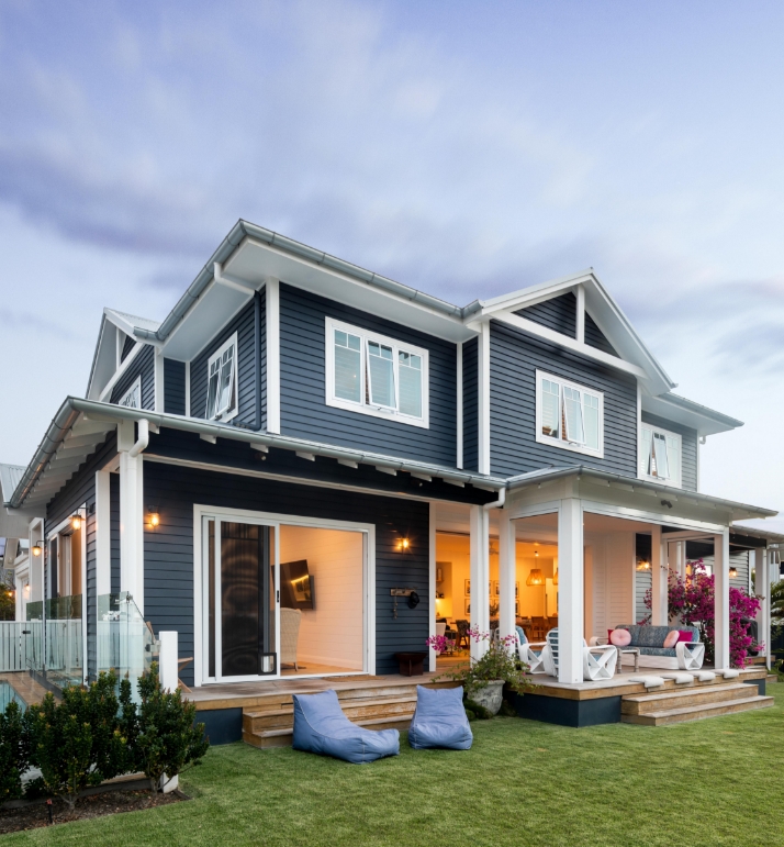 Externally, this home exudes coastal Hampton vibes with its striking navy blue facade, beautifully complemented by crisp white windows and trims. The attention to detail in both design and execution is evident, creating a truly captivating residence that harmonizes with its breathtaking surroundings.