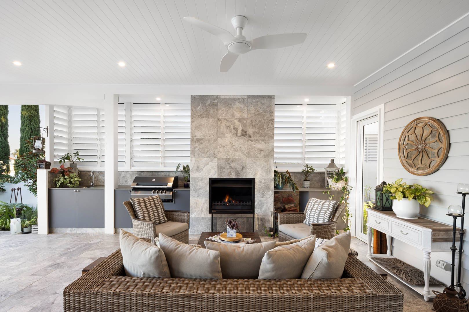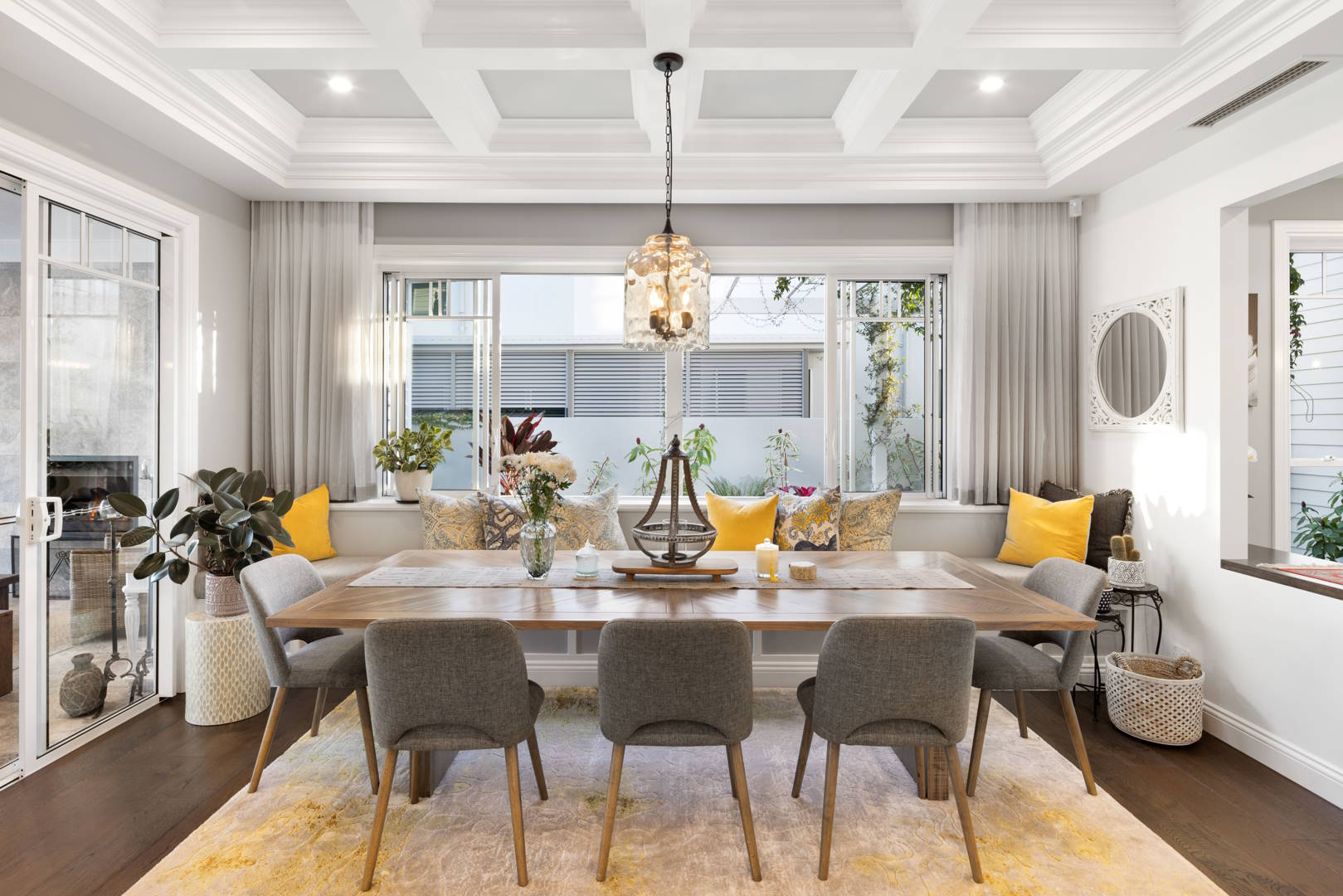 The living area boasts a striking two-way fireplace that also serves as a captivating statement piece, complemented by coffered ceiling details in the dining area. Additionally, a home office and versatile media/multi-purpose rooms, along with an extra rumpus room, offer abundant space for work and leisure.