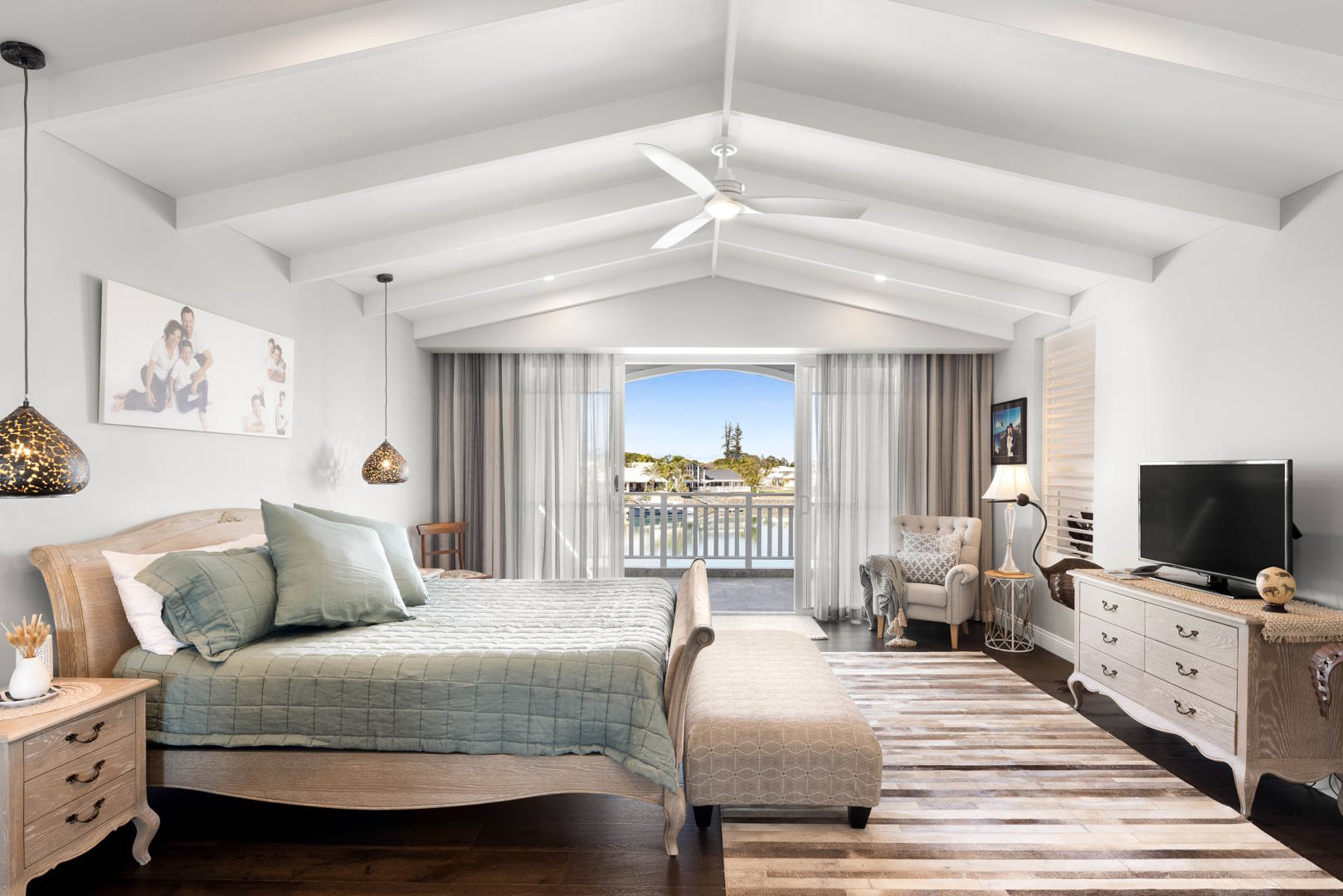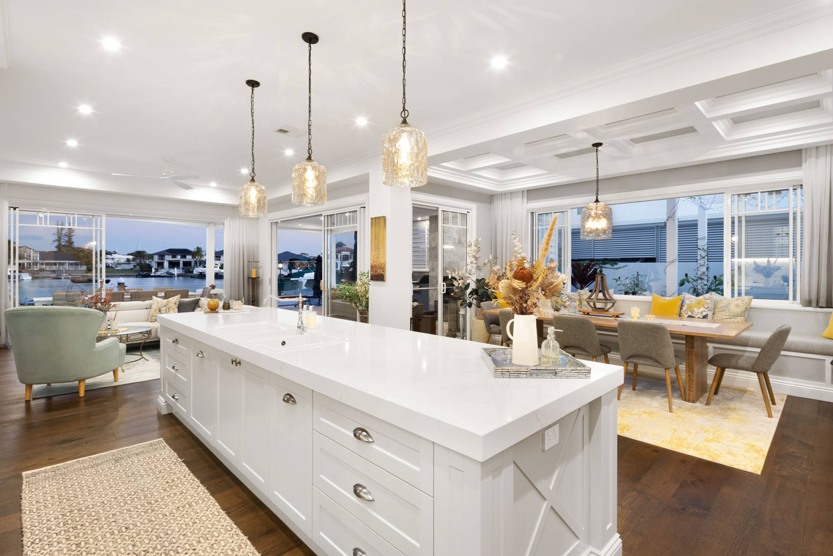 The master suite is a true retreat, featuring a luxurious walk-in robe, an ensuite with picturesque canal views, and an extended balcony. The heart of the home lies in the open-plan living and dining area, which seamlessly flows to the alfresco and pool.
